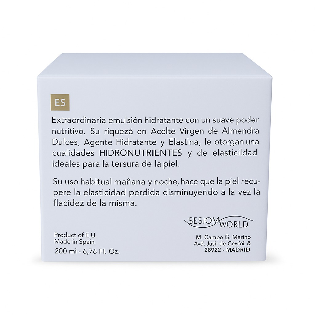 Emulsión hidratante Facial con un suave poder nutritivo. Aceite virgen de Almendras Dulces, Agente hidratante y Elástina le otorgan unas cualidades Hidronutrientes para la elasticidad y la tersura de la piel.